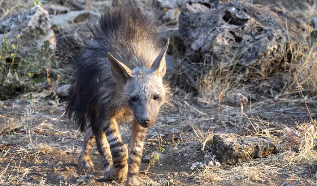 In Namibia, the brown hyena’s preferred habitat includes areas with ample cover, such as rocky outcrops and dense shrublands, where they can find shelter and establish dens. These dens are often located in caves or burrows and are used to rear their young and as a base from which they forage.
