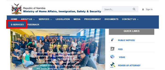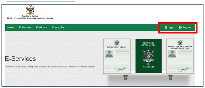 Visit the official Namibian Ministry of Home Affairs website and click on E-Services to begin your application.