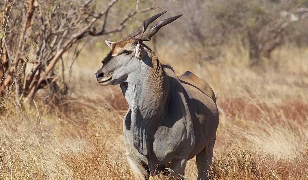 The eland is Africa’s largest antelope, an impressive and powerful animal weighing up to 900 kg (2,000 lbs). Despite their size, eland are shy, cautious, and often difficult to approach. Mature bulls develop a thick dewlap, a spiral pattern on the sides, and heavy, ridged horns.