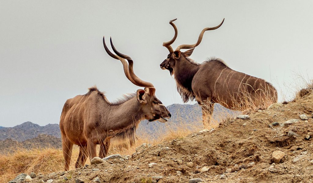 The greater kudu (Tragelaphus strepsiceros) is one of Africa’s most sought-after hunting trophies. Renowned for its spiral horns, striking white stripes, and elusive nature, kudu hunting is a highlight of any Namibian safari. Bulls can grow horns exceeding 50 inches (127 cm), and exceptional trophies often measure over 60 inches (152 cm).
