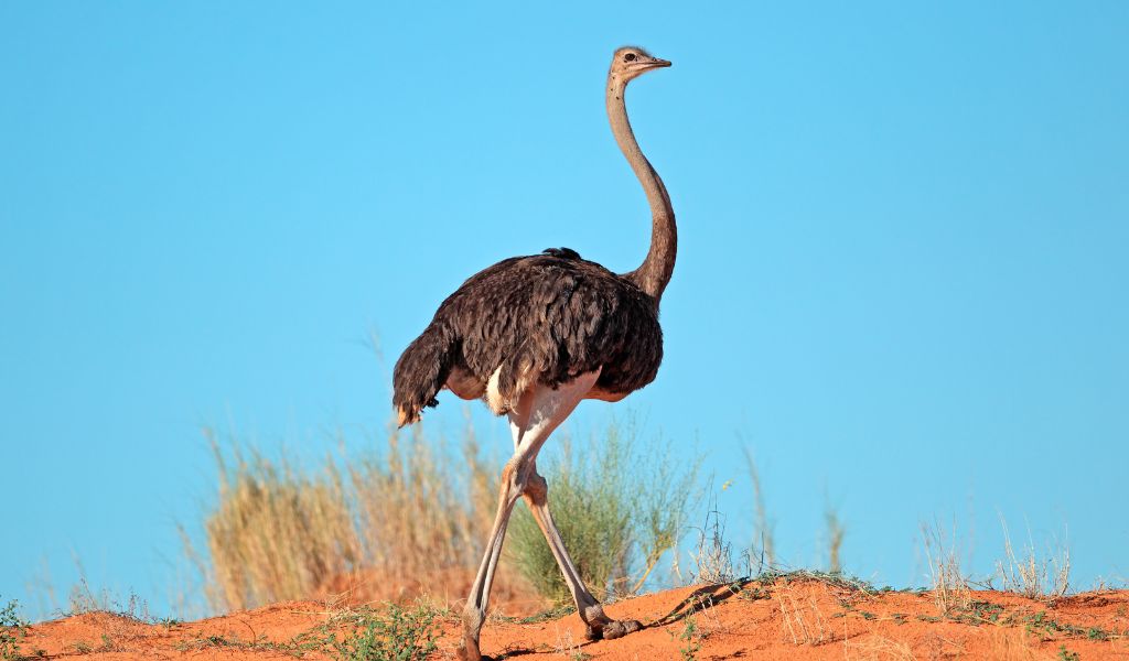 Males are easily identified by their striking black plumage with white wing and tail feathers, while females have brown and grey coloration that blends into the surrounding environment. Their long necks and powerful legs allow them to run at speeds of up to 70 km/h, making them one of the fastest animals on the African plains.