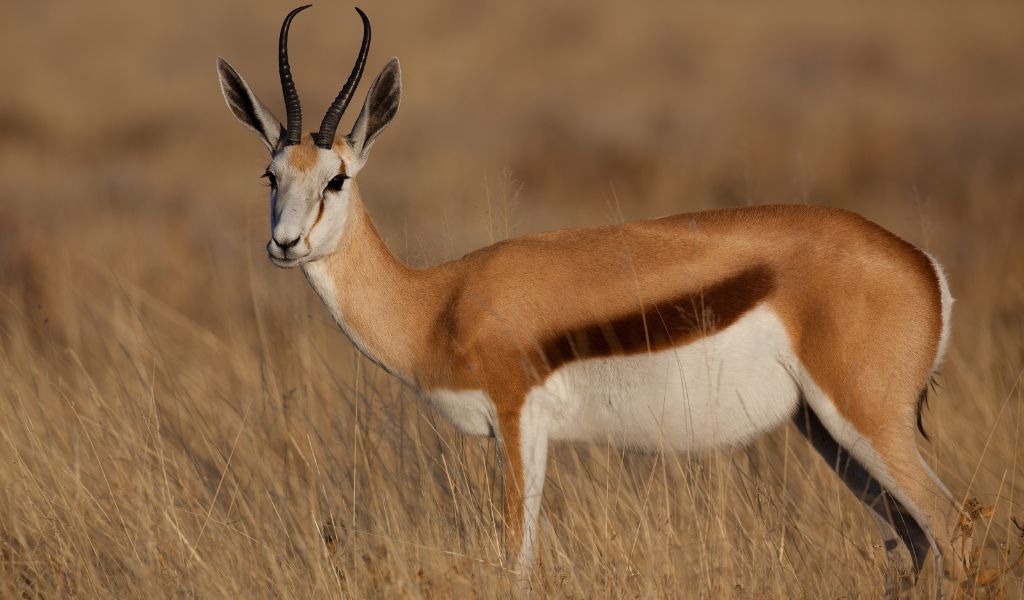 The springbok (Antidorcas marsupialis) is Namibia’s national animal and one of the most recognizable species in southern Africa. Known for its alert nature and distinctive “pronking” display, springbok are a classic plains game trophy.